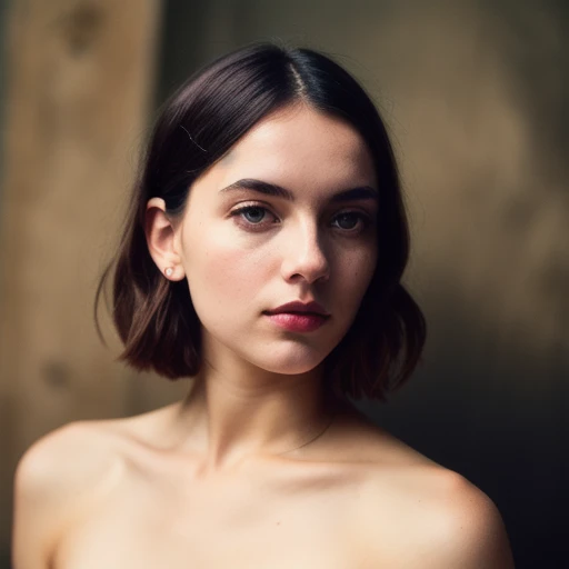 a closeup portrait of a playful maid, undercut hair, apron, amazing body, pronounced feminine feature, busty, kitchen, [blonde hair], freckles, flirting with camera